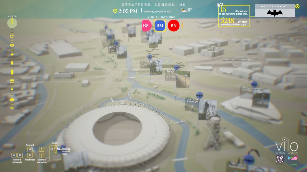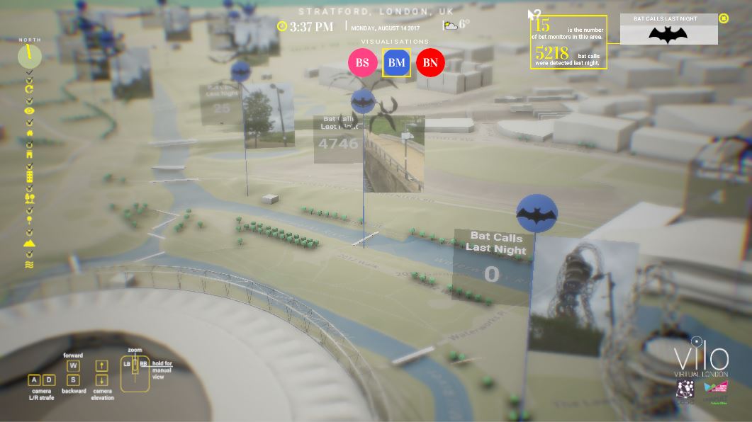 In the past weeks I’ve been collaborating with researchers at the Intel Collaborative Research Institute (ICRI) for Urban IoT to integrate data from bat monitors on the Queen Elizabeth Olympic Park into CASA’s digital visualisation platform, ViLo. At present we are visualising the geographic location of each bat monitor with a pin that includes an image showing the locational context of each sensor and a flag indicating the total number of bat calls recorded by that sensor on the previous evening. A summary box in the user interface indicates the total number of bat monitors in the vicinity and the total number of bat calls recorded the previous evening. Animated bats are also displayed above pins to help users quickly identify which bat monitors have results from the previous evening to look at.